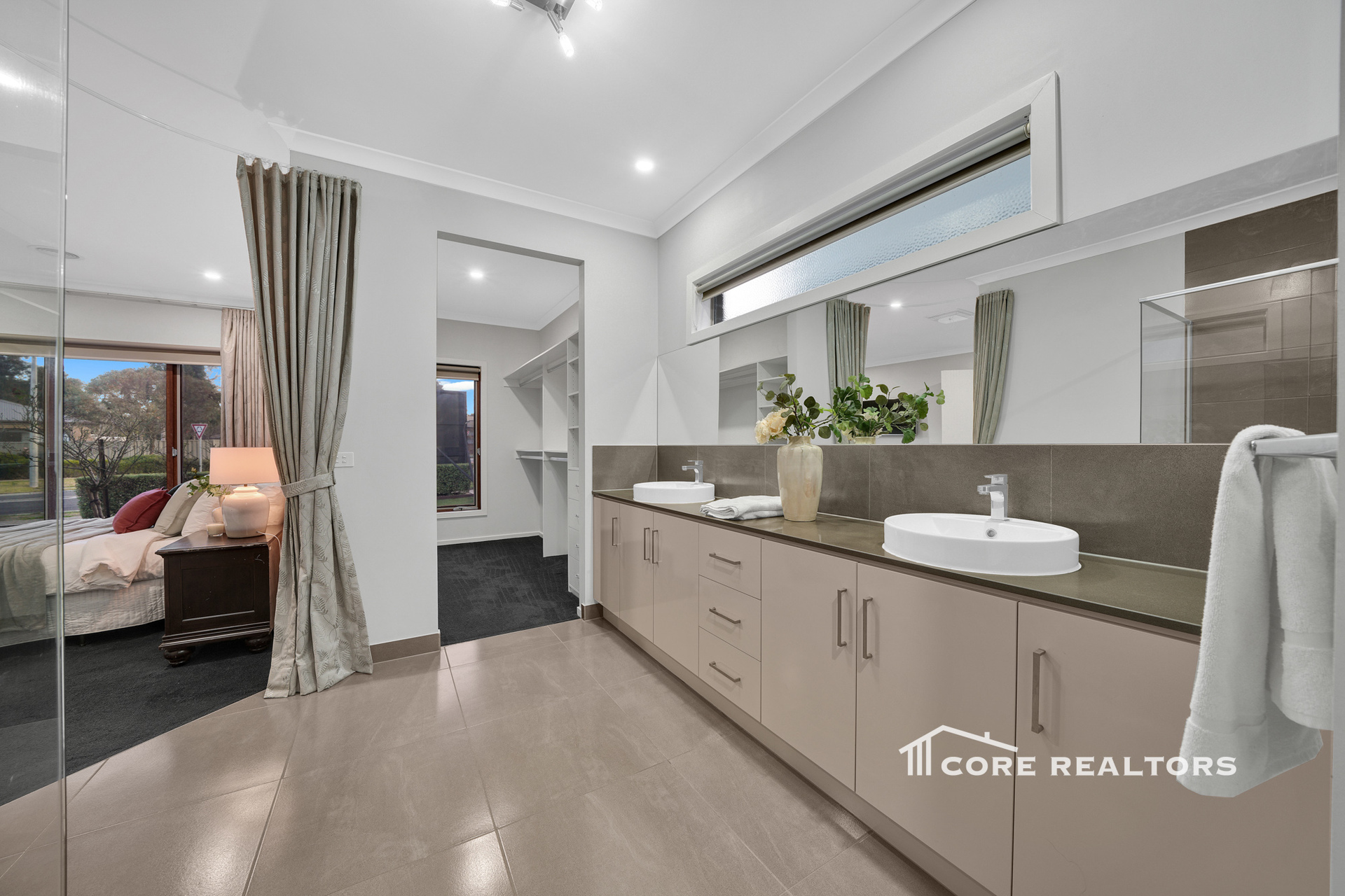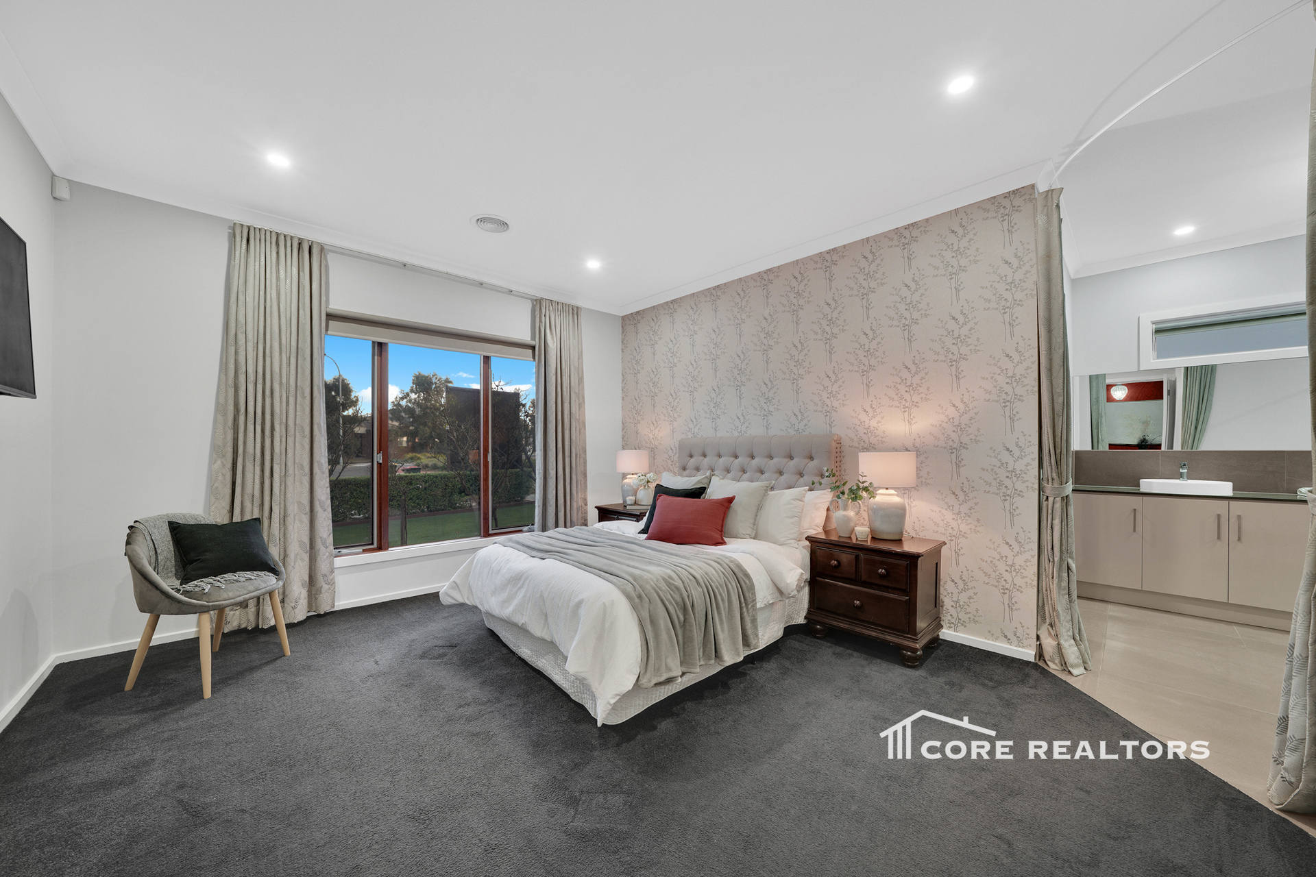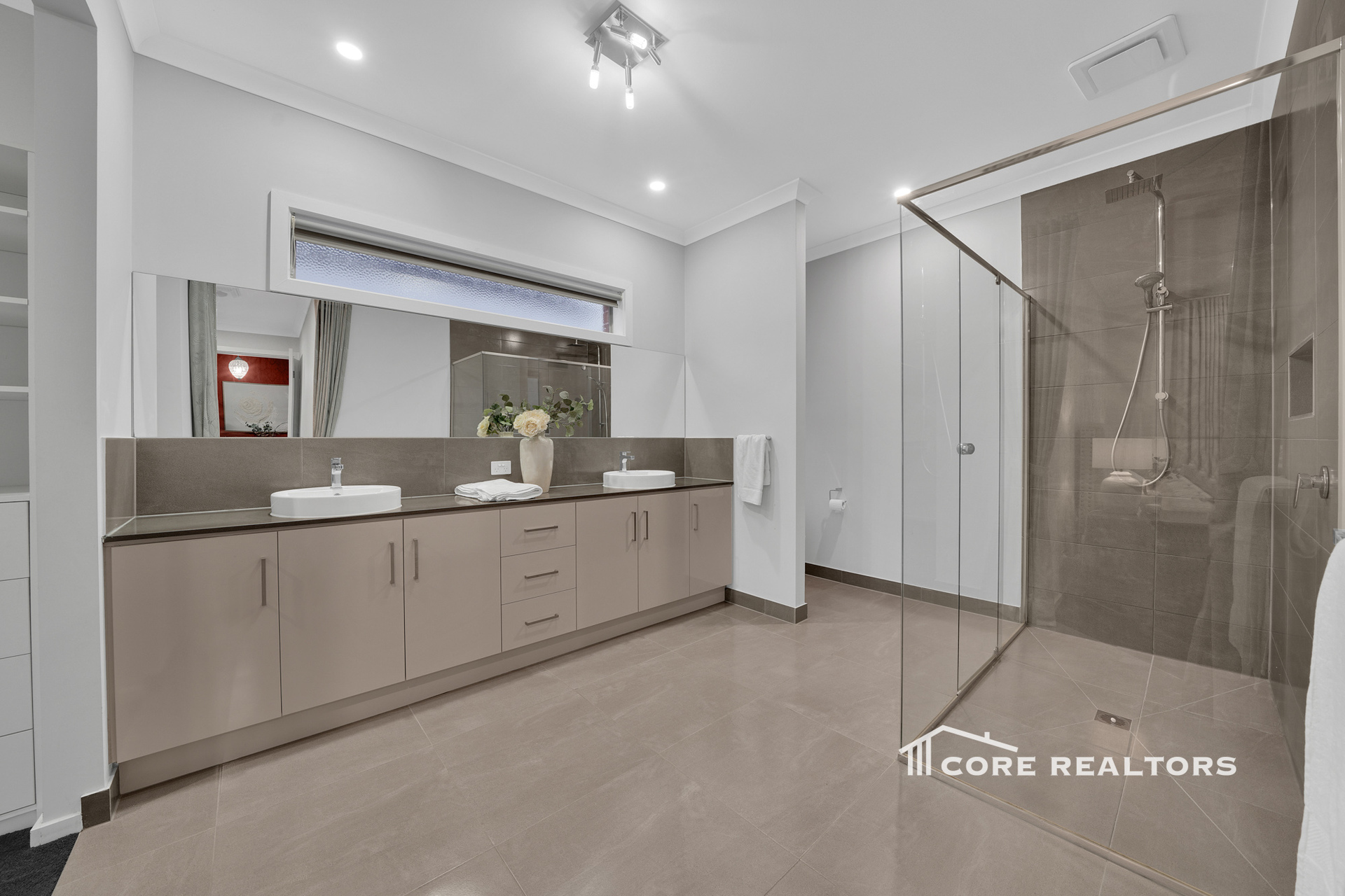 Luxurious Master Suite: A generously sized master bedroom with tall double-door entry, a large walk-in robe, and a spacious ensuite featuring a double vanity, oversized shower, and toilet.